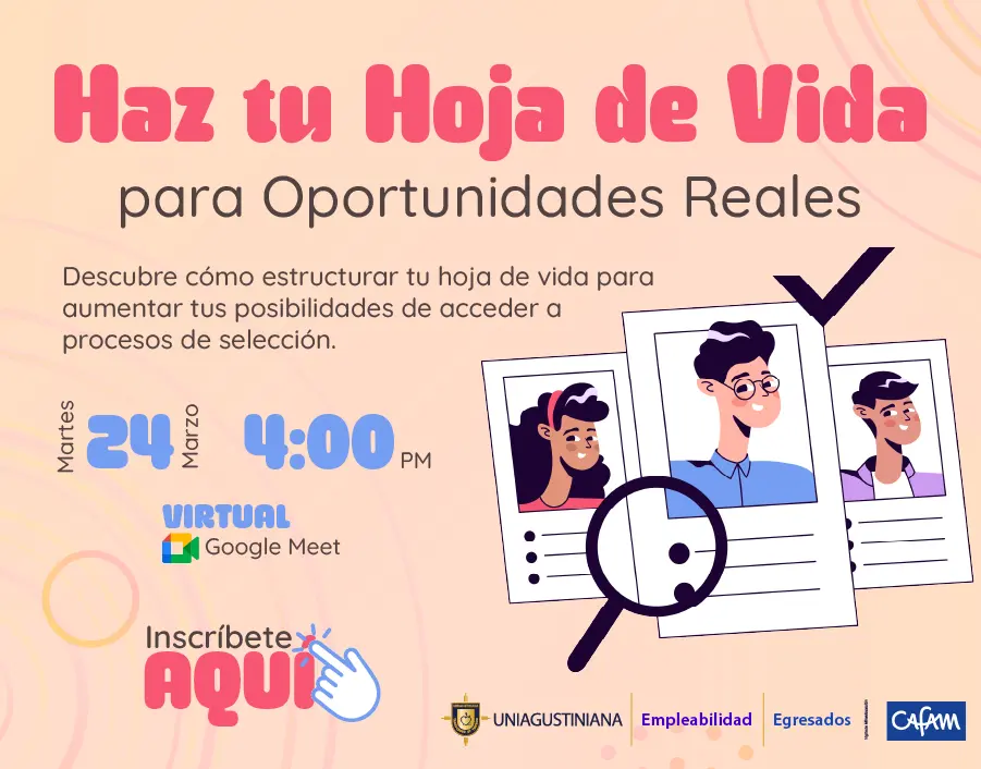 ¡Haz tu Hoja de Vida para Oportunidades Reales! Aprende a presentar tu perfil de forma clara, estratégica y alineada al mercado laboral. 00 days 00 hours 00 minutes 00 seconds Date Mar 24 2026 Time 9:00 pm - 11:00 pm Local Time Timezone: America/New_York Date: Mar 24 2026 Time: 5:00 pm - 7:00 pm